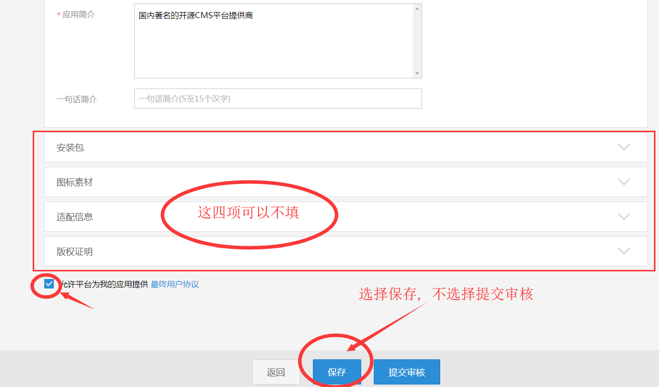 带*星号的都要填写,其它就不用理他。最后选择保存即可。不用提交审核。提交审核是为了上架腾讯的安卓应用市场 。想要上架应用市场要求很高,要填写与上传的资料很多。所以不用提交审核。只需要保存,就可以使用登录接口了。.